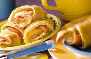 - Open het blikje croissantdeeg, rol de plak deeg uit op het aanrecht en verdeel hem volgens de lijnen in 6 stukken. Snijd elk stuk weer doormidden tot een kleine driehoek.
