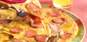 - Houd 4 plakjes pekelvlees apart en snijd de rest in smalle reepjes.